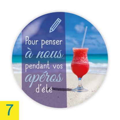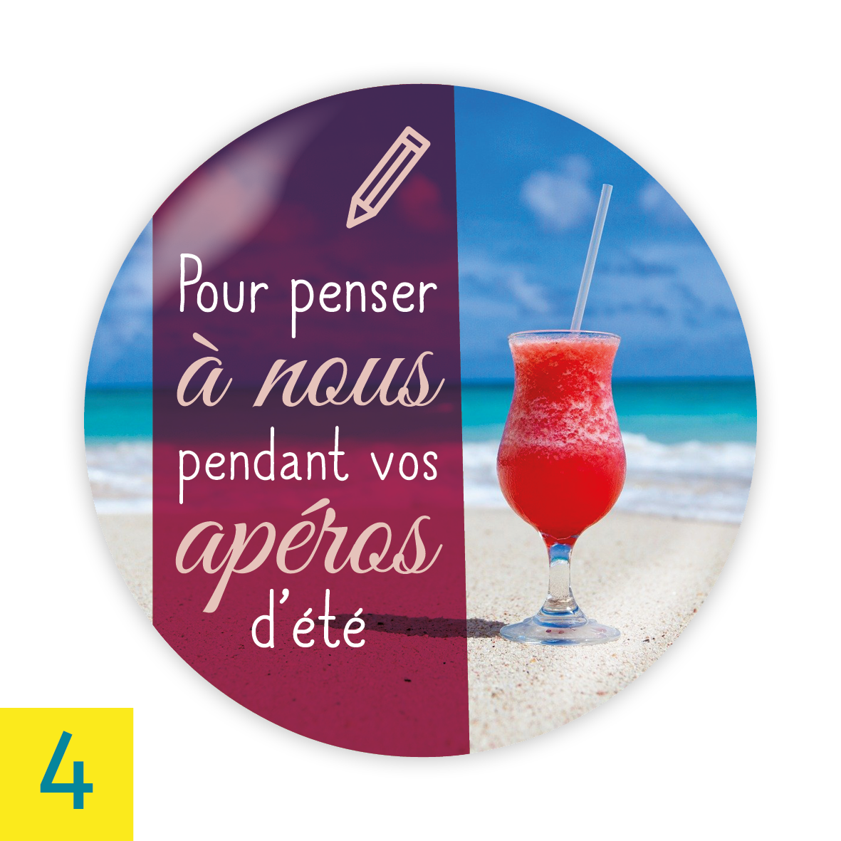 Badge 56 mm, Badge 75 mm, Aimant 56 mm, Aimant 75 mm, Miroir de poche 75 mm, Décapsuleur aimanté 56 mm