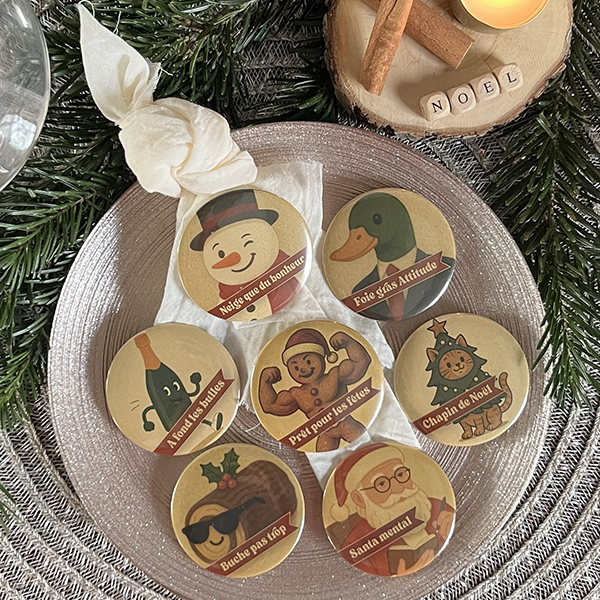 • Les badges ont une épingle type épingle à nourrice. Possibilité de rajouter à la commande un aimant pour mettre de l’autre côté du vêtement et éviter de devoir piquer l’épingle dans celui-ci.